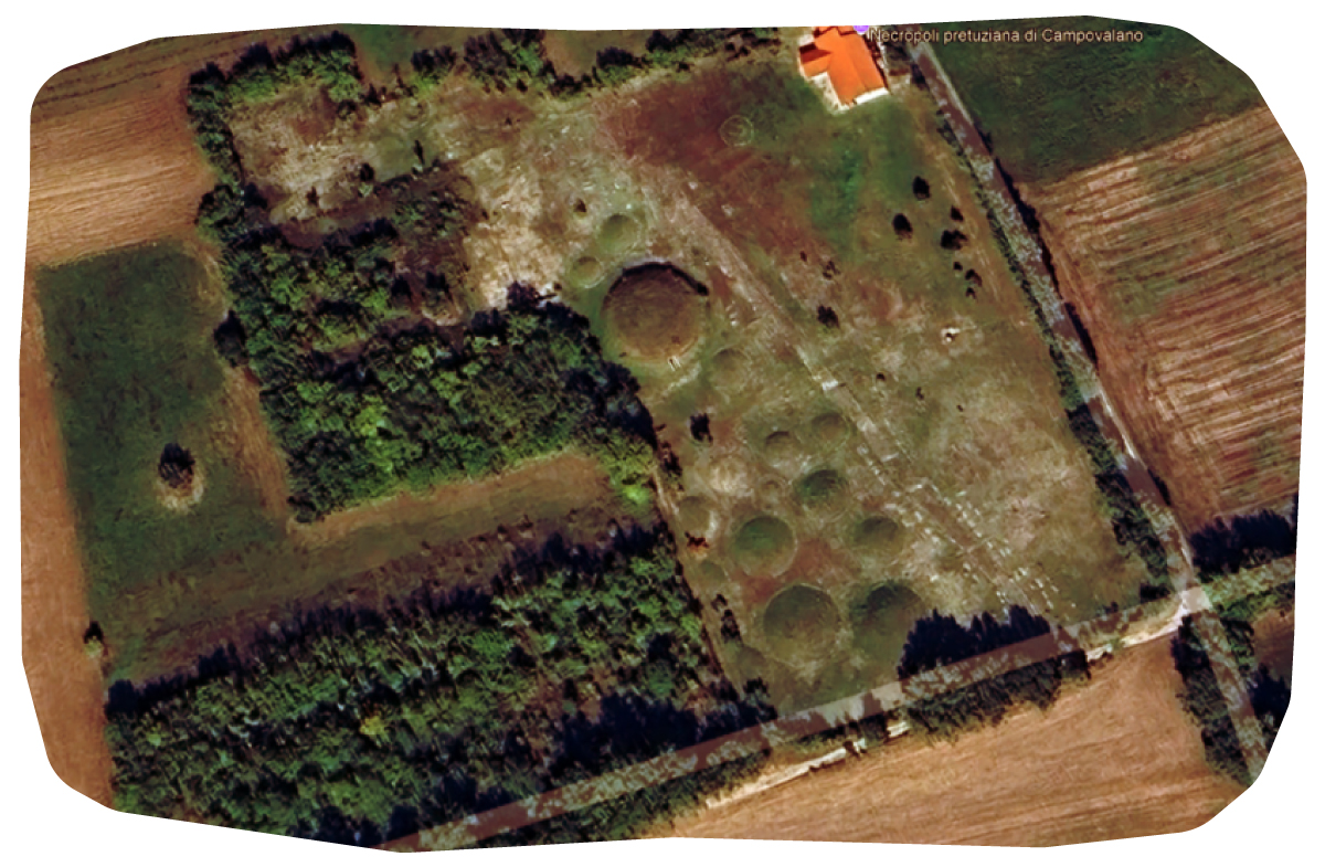 L’area archeologica di Campovalano si trova su un pianoro ai piedi della montagna di Campli ed è stata frequentata almeno dalla fine dall’età del Bronzo (XIV-XIII sec. a.C.) da un piccolo insediamento la cui presenza è testimoniata da frammenti ceramici decorati, punte di freccia in selce e resti di intonaco di capanne.