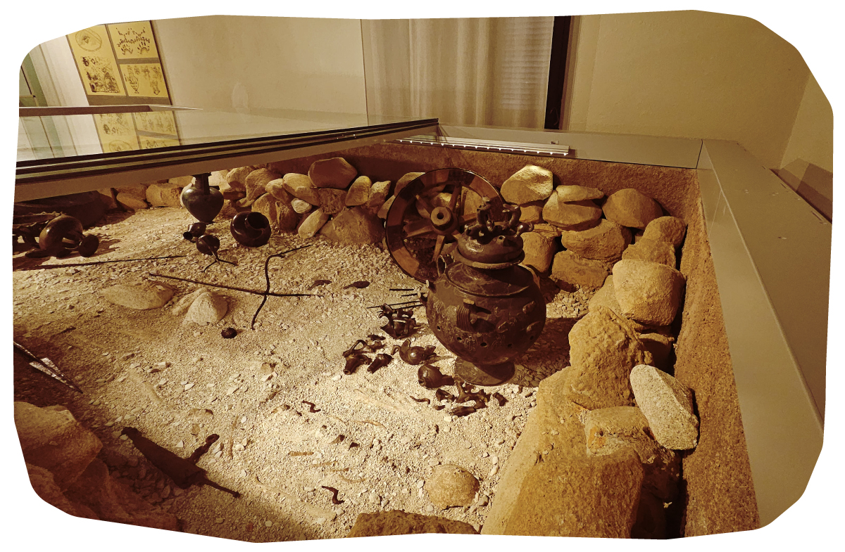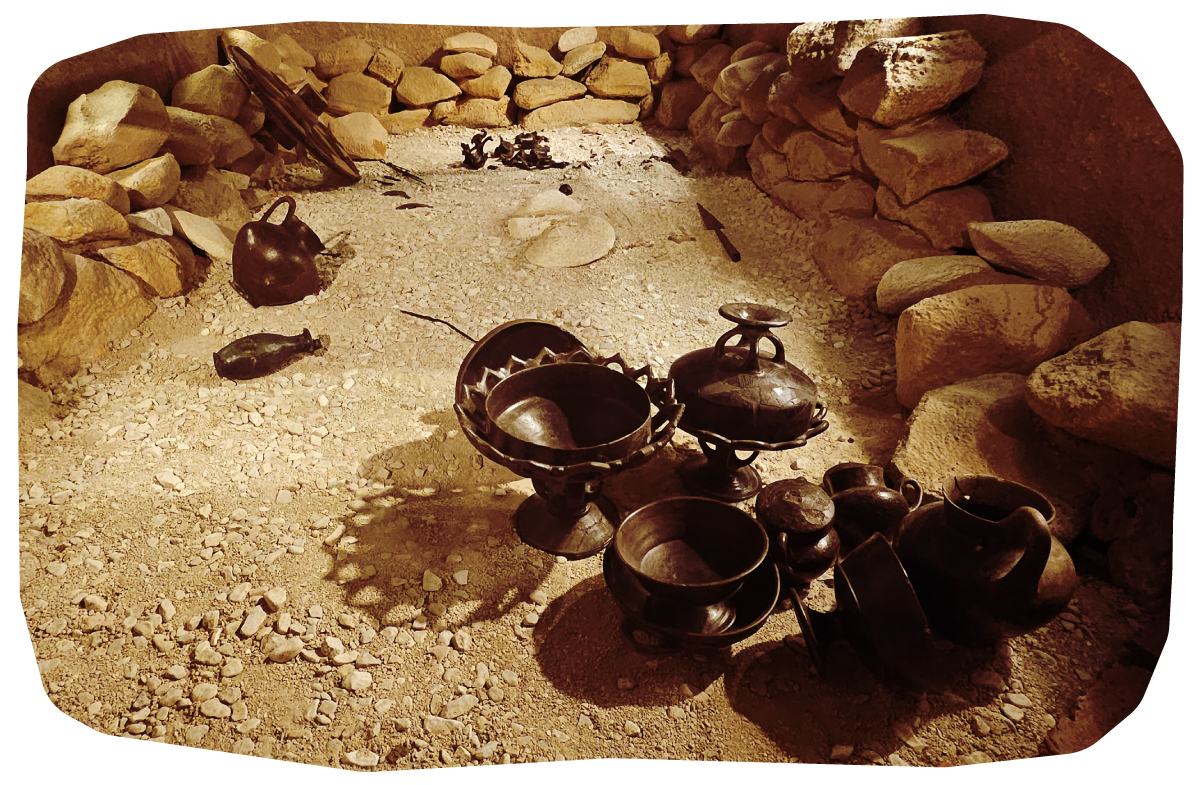 Questo tipo di tombe, per la maggior parte disposte ad ovest della strada cerimoniale, avevano un diametro variabile in base all’età e al sesso dell’inumato ed anche del ruolo che doveva rivestire all’interno della società. Vasi in ceramica e in metallo erano gli elementi ricorrenti nei corredi che si distinguevano per la presenza di armi (spade, lance, giavellotti, mazze ferrate) nel caso degli uomini e fuseruole, pesi da telaio, cinturoni e pendenti nel caso delle donne. All’interno dell’area archeologica è stata ricostruita con dimensioni reali la sepoltura più grande rinvenuta fino ad oggi, la Tomba 2, e al suo interno si può ammirare la ricostruzione di come era stata predisposta la sepoltura, con il defunto deposto su un lato della fossa, il corredo vascolare in ceramica e metallo ai piedi, ai lati le armi e sul lato il carro da parata, elemento che di sicuro sottolinea la sua posizione prominente all’interno della comunità.